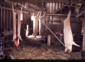 We had unlimited compost from chicken manure that had rotted for years behind some old chicken houses. I had little experience gardening besides helping my mother grow tomato plants in North Carolina. What I did have was inspiration from Helen and Scott Nearing and Malabar Farm. Gardening in Nova Scotia on the foggy North Mountain by the Bay of Fundy required a lot more expertise than in North Carolina. Still the abundance from the garden was overwhelming until my mother and her sister, both experienced canners, showed up to help us through that first harvest. We filled the freezer and the cupboards. That winter we butchered a steer we had fattened from our herd. We hung it age in our cellar before carving it up. The next summer we raised pigs, one for us and three more for neighbors. We butchered them with the help of neighbors in the fall, topped up the freezer and made crocks of salt pork. It was an amazing amount of work that made me appreciate all the fresh pork in the fall that our relatives had always given my mother and me.