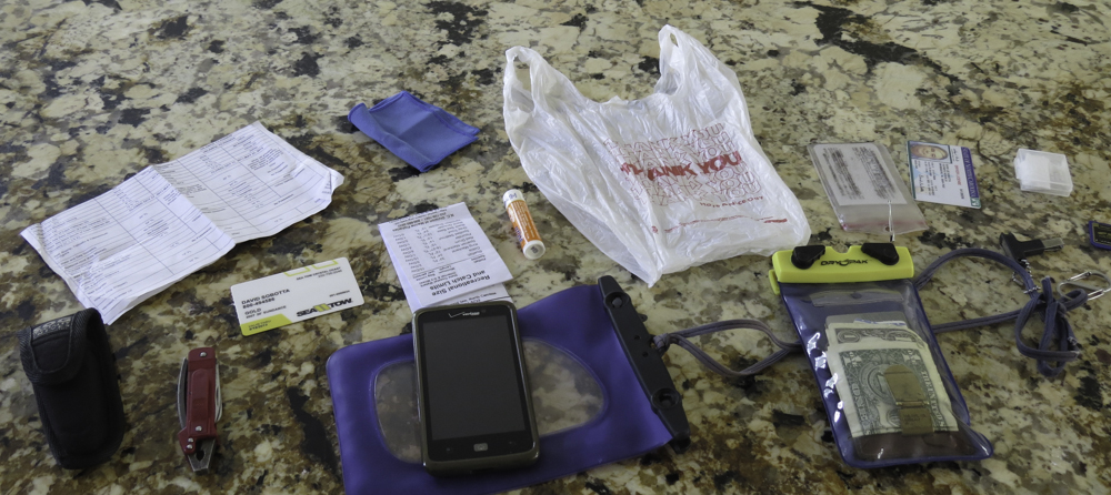 Next is my wallet which has exactly $2.00 in cash which happens to be the cost of a bag of ice from one of the automated ice machines. Under the two dollars is one business card and one band-aid. The small clip style wallet is in a waterproof case. Above that is my fishing license, an old driver’s license, and a plastic box with two aspirins. Just to the right and below the box of aspirins is a spare SD card for my camera.
